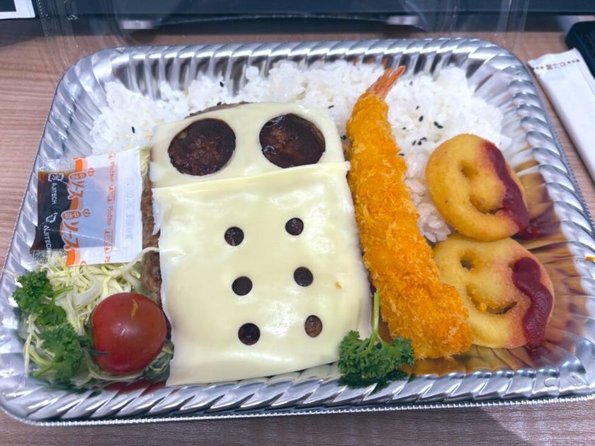 ベースは大きなハンバーグ弁当なのですが、スライスチーズで作られたお面や